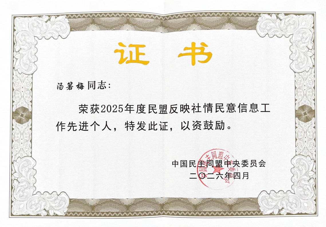 汤箬梅教授长期扎根教学科研一线,在艺术设计领域深耕细作的同时,积极投身参政议政工作。她充分发挥专业优势,围绕文化传承创新、文旅融合发展、乡村振兴、儿童友好等议题深入调研,撰写多篇高质量社情民意信息和提案建议,为地方经济社会发展和文化繁荣贡献了智慧和力量。其中一则关于文化遗产思政教育的咨政建议作为民盟省委集体提案,被省政协十三届四次会议采纳立案。另有一则关于儿童友好方面的社情民意信息获全国政协、民盟中央采纳。此次荣获民盟中央、民盟省委双项表彰,既是对汤箬梅教授个人履职成效的高度肯定,也是对我校统一战线和党外知识分子队伍建设成果的有力彰显。